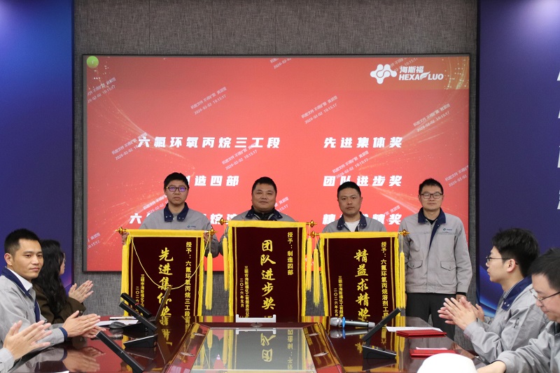 会上,还进行了先进团队的表彰。2025年,各部门圆满完成了公司各项工作。其中,六氟环氧丙烷溶剂工段在精益推行月度评分、领导重视程度、全员推行效果三个维度评比中得分最高,荣获“精益求精奖”;制造四部在新产品生产攻坚中表现突出、成果亮眼,荣获“团队进步奖”;六氟环氧丙烷三工段积极推进技术改造项目,推动生产自动化水平大幅提升,荣获“先进集体奖”。